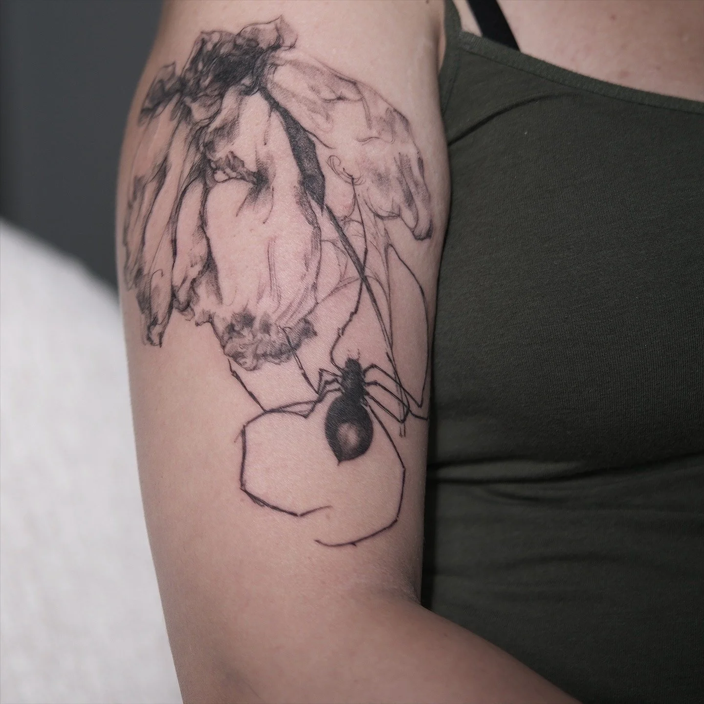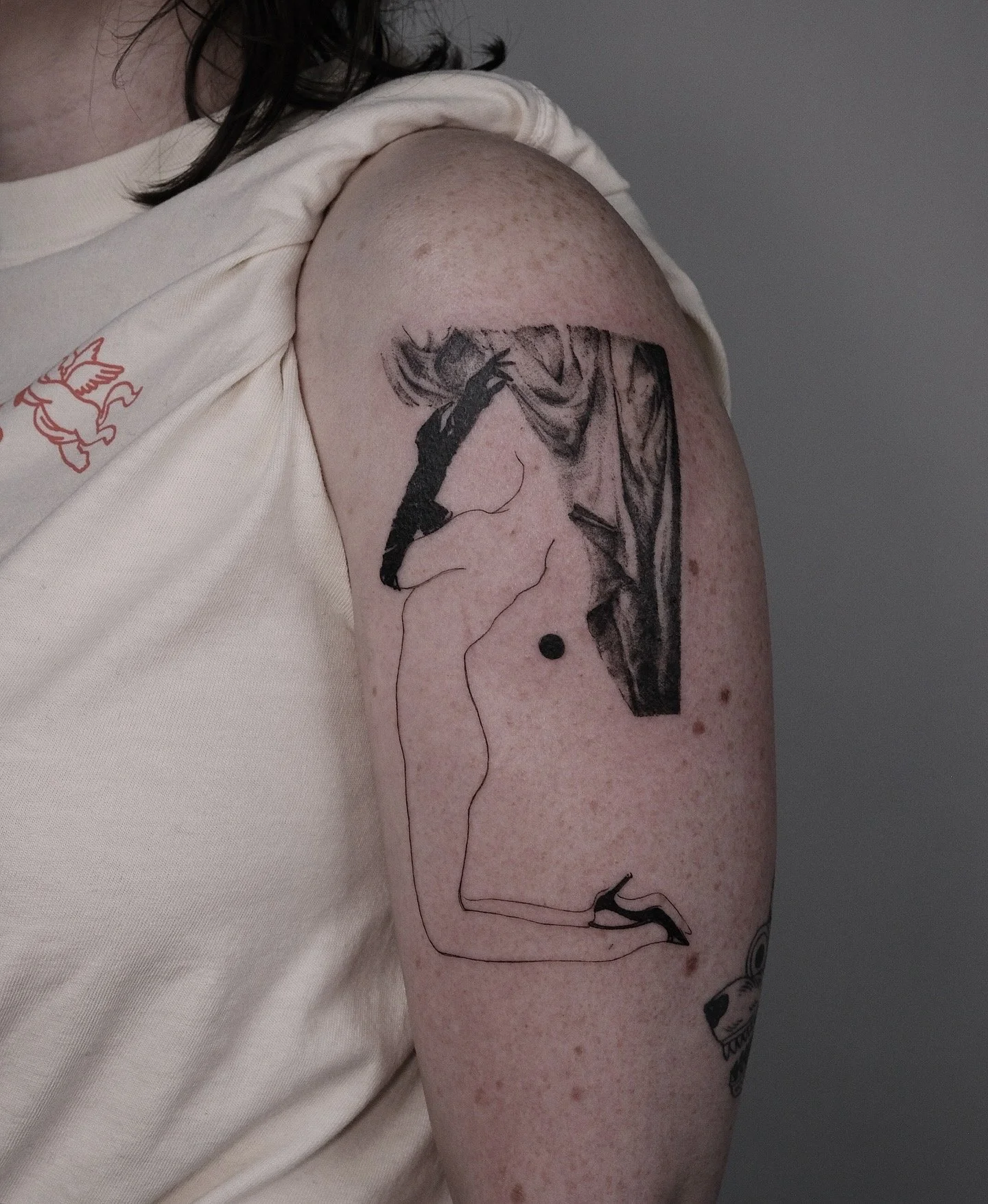 Drawing inspiration from both classical and contemporary influences like Robert Mapplethorpe, Edvard Munch, and Marina Abramović, her tattoos often carry a dreamlike, almost cinematic quality. The designs feature a mix of delicate shading, fine lines and bold outlines, embracing the imperfections and natural rhythm of hand-drawn sketches.